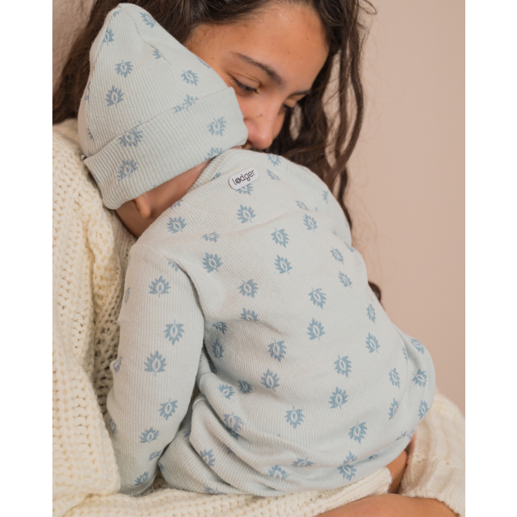 Kombinieren Sie den Newborn-Strampler mit unseren passenden Baumwoll-Babypantoffeln und Babymütze.