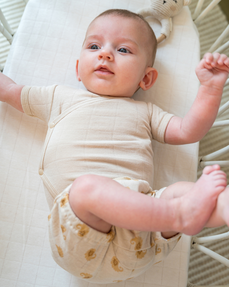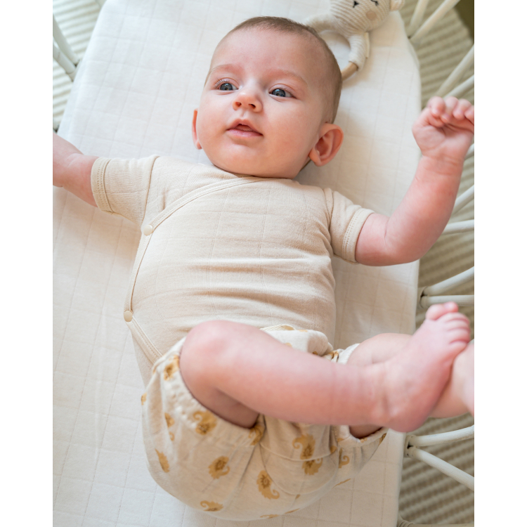 Unser Kurzarm Body für Babys hat dank der 100 % gestrickten Baumwolle eine perfekte Passform. Die gestrickte Baumwolle macht den Body flexibel und bequem. Unsere Kurzarm-Bodys für Babys tragen das Gütezeichen von Oeko-Tex ""Textiles Vertrauen"". Durch den praktischen Umschlag mit Druckknöpfen wird das Anziehen des Babys noch einfacher. Der Komfort unserer Kurzarm-Bodys besteht darin, dass genügend Platz für die Windel vorhanden ist, so dass der Body nicht an den Beinen kneift.