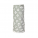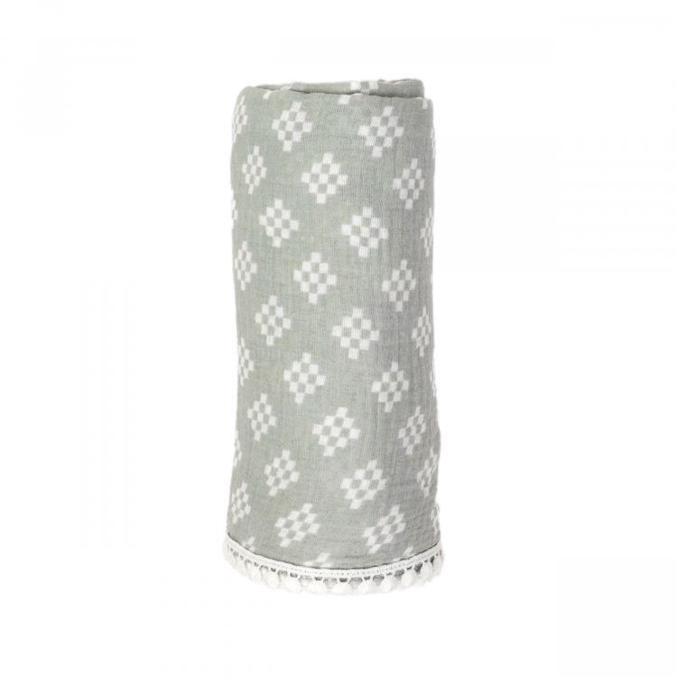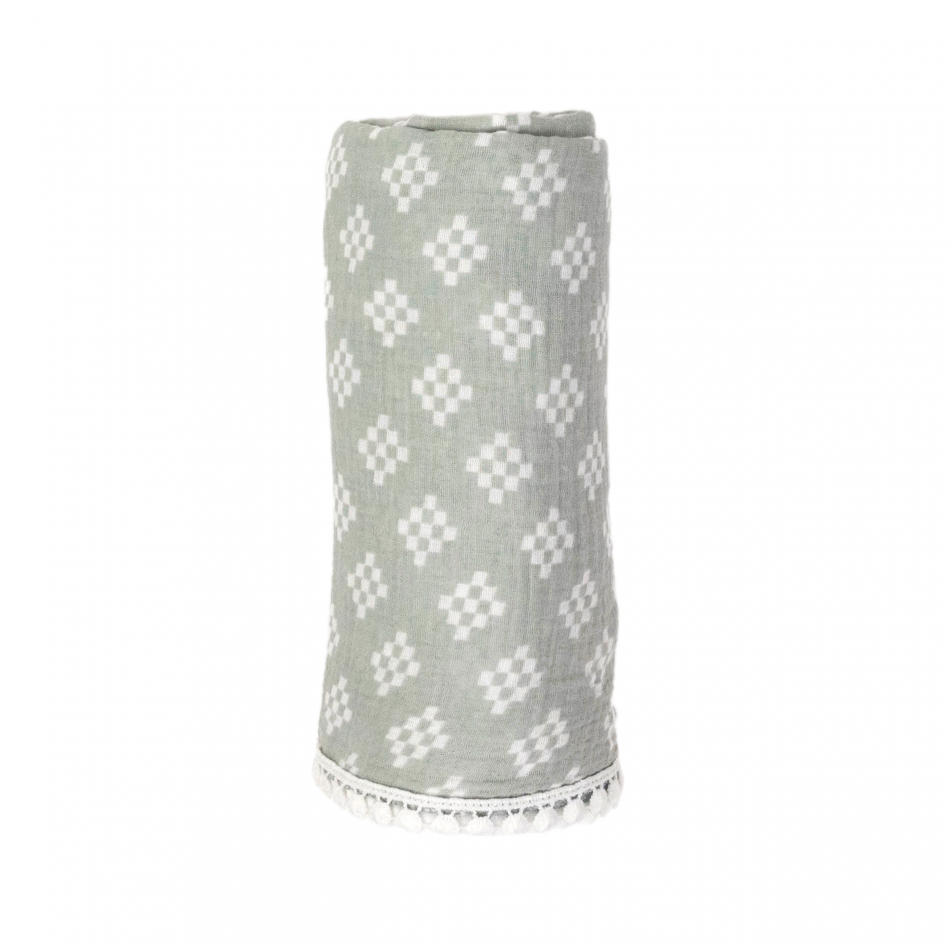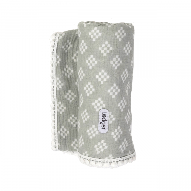 Dieses Tuch hat einen dekorativen Rand mit kleinen weichen Kugeln. Es lässt sich gut mit den anderen Mullartikeln kombinieren.