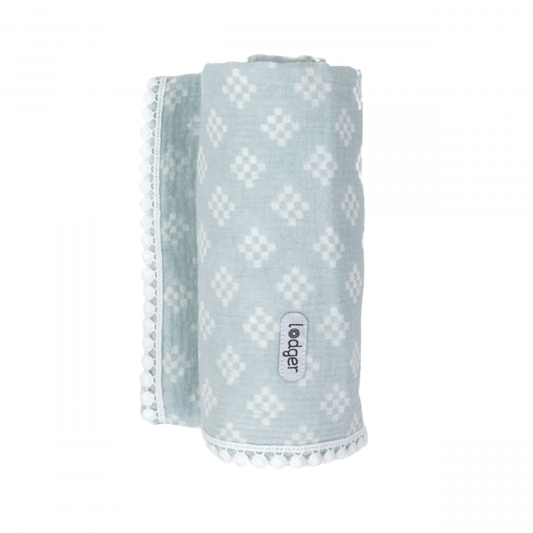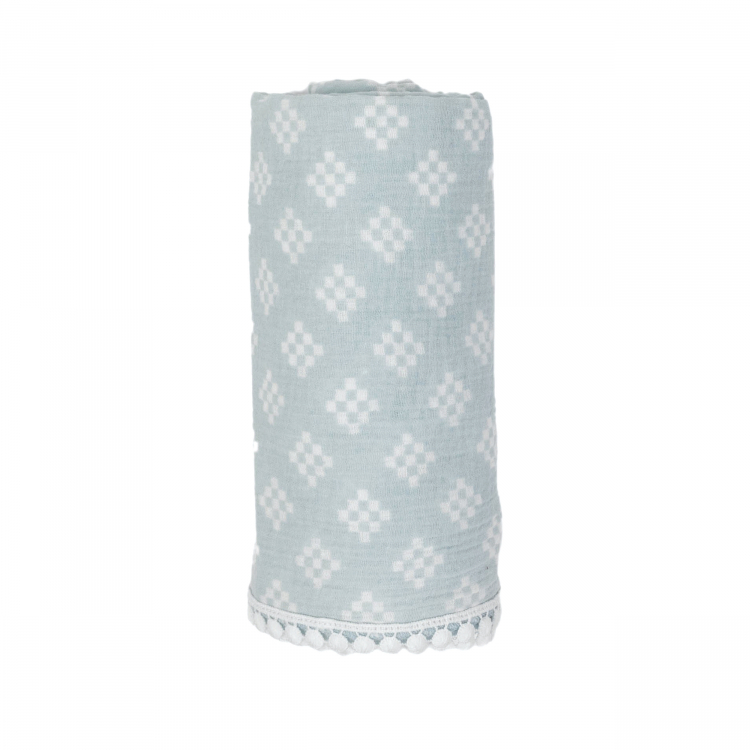Dieses Tuch hat einen dekorativen Rand mit kleinen weichen Kugeln. Es lässt sich gut mit den anderen Mullartikeln kombinieren.