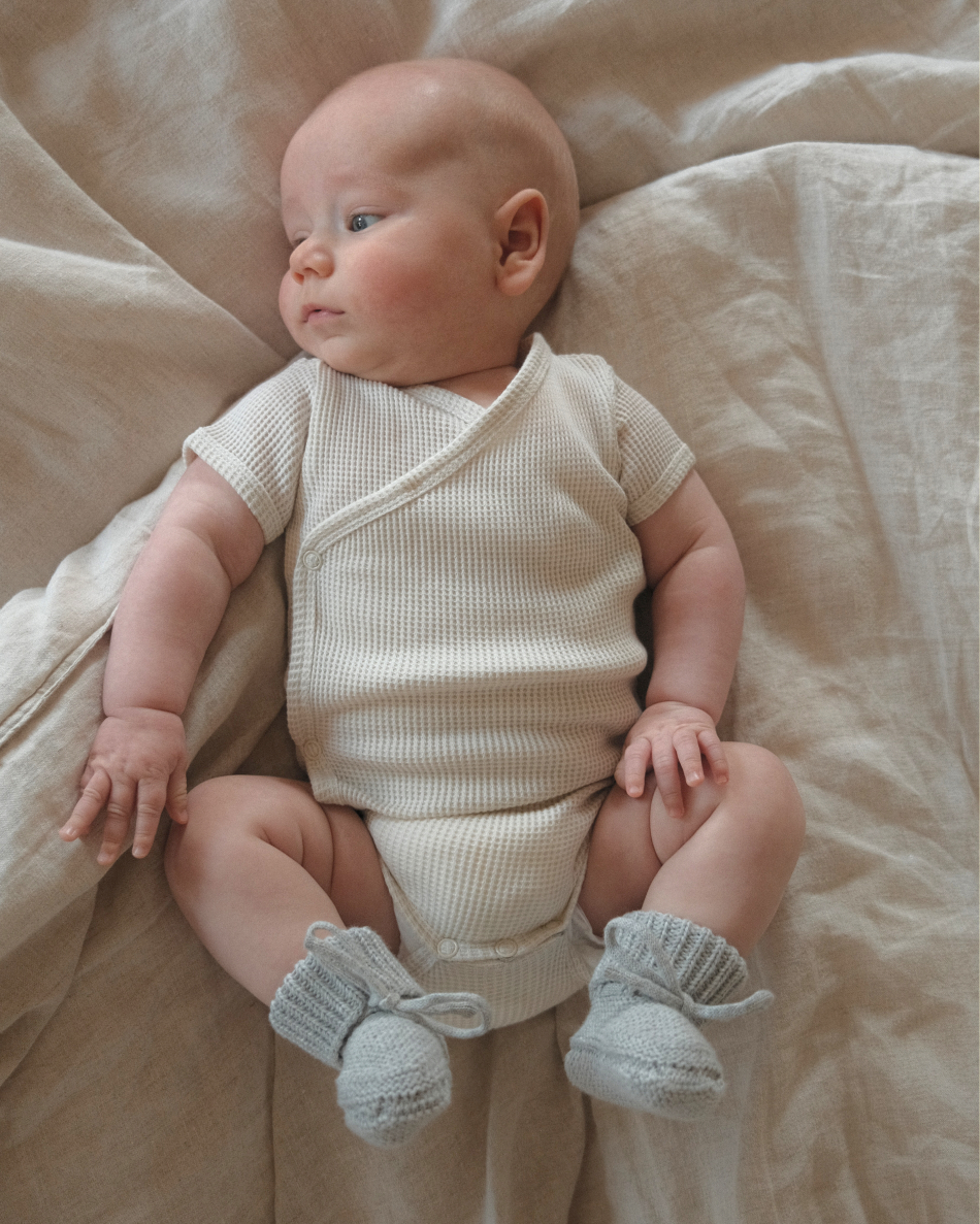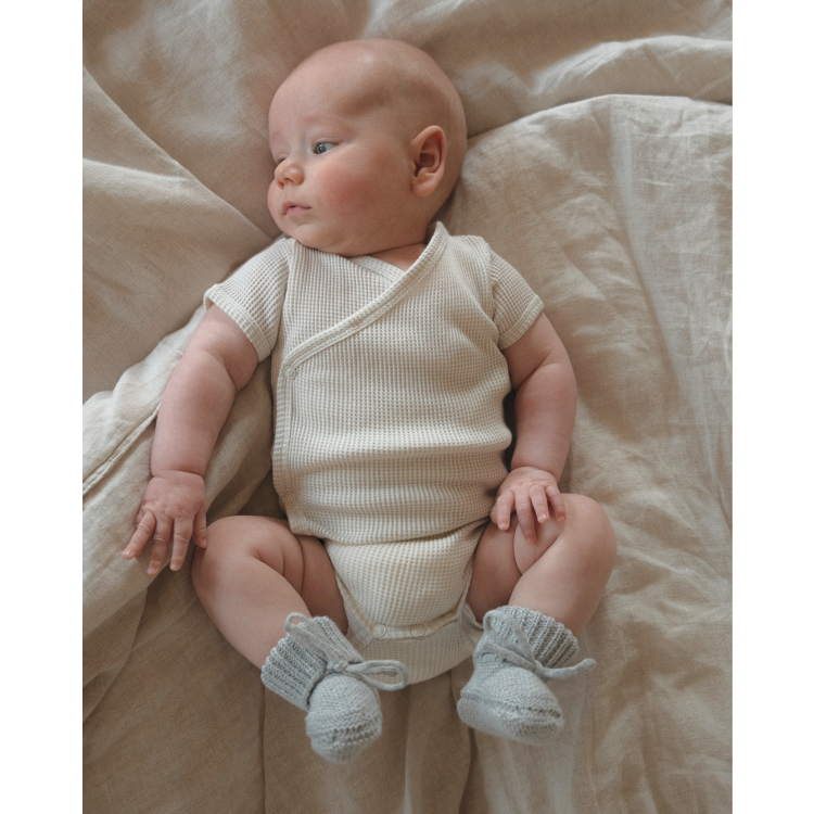 Bei Neugeborenen ist es wichtig, einen Kurzarm-Body zu wählen. Unsere Bodys sind für Neugeborene sehr geeignet, da sie aus 100 % gestrickter Baumwolle mit dem Gütezeichen von Oeko-Tex hergestellt sind. Der Umschlag mit Druckknöpfen macht das Anziehen des Babys sehr einfach. Diese Baby-Bodys haben zusätzliche Falten am unteren Ende, damit mehr Platz für die Windel ist und die Ränder nicht einschneiden. Luftiger und weicher Body für Frühling und Sommer