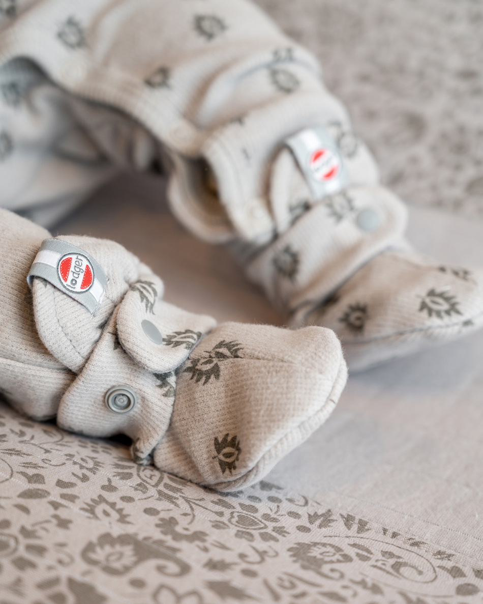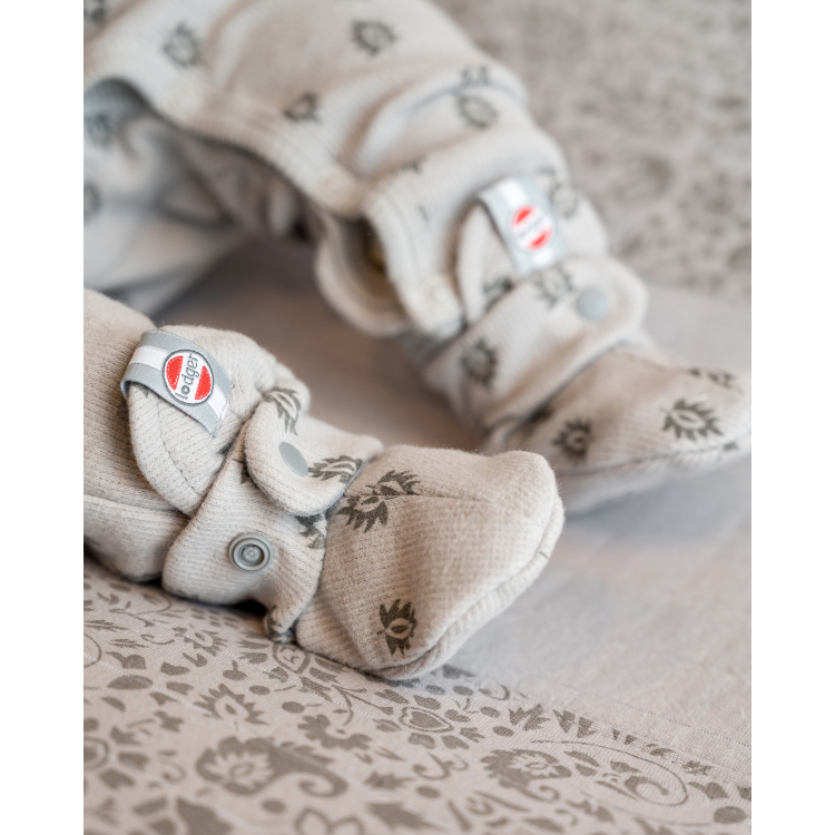 These baby slippers are made of 100% breathable cotton with quality label 'confidence in textile' by Oeko-Tex. Due to the snap buttons the baby shoes are easy to put on and will stay on. The biggest size baby shoes (6-12 months) have a anti slip sole, which is very convenient for crawling and taking first steps.
