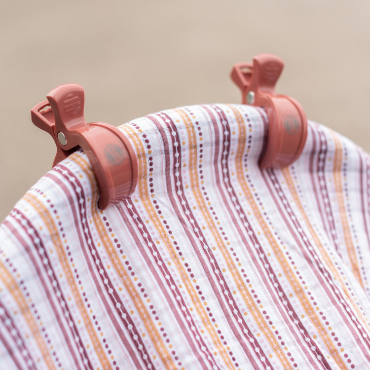 Use the Swaddle Clips in combination with a swaddle to protect your baby from weather influences or other external stimuli. This way you can make sure your baby can sleep quitely in the maxi cosi or pram. Pay attention that you do not cover the pram or maxi cosi completely.
