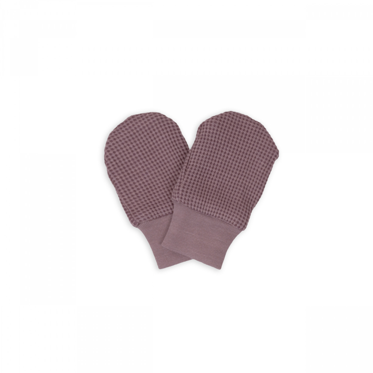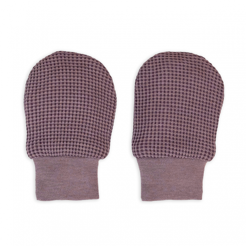 Baby scrats mittens made of cotton with a waffle structure. The baby mittens are specially designed to prevent newborns from scratching themselves with their sharp nails while sleeping. The anti-scratch mittens are lined. Easy to put on due to the stretchy rib material of the trim.