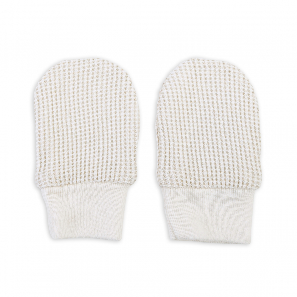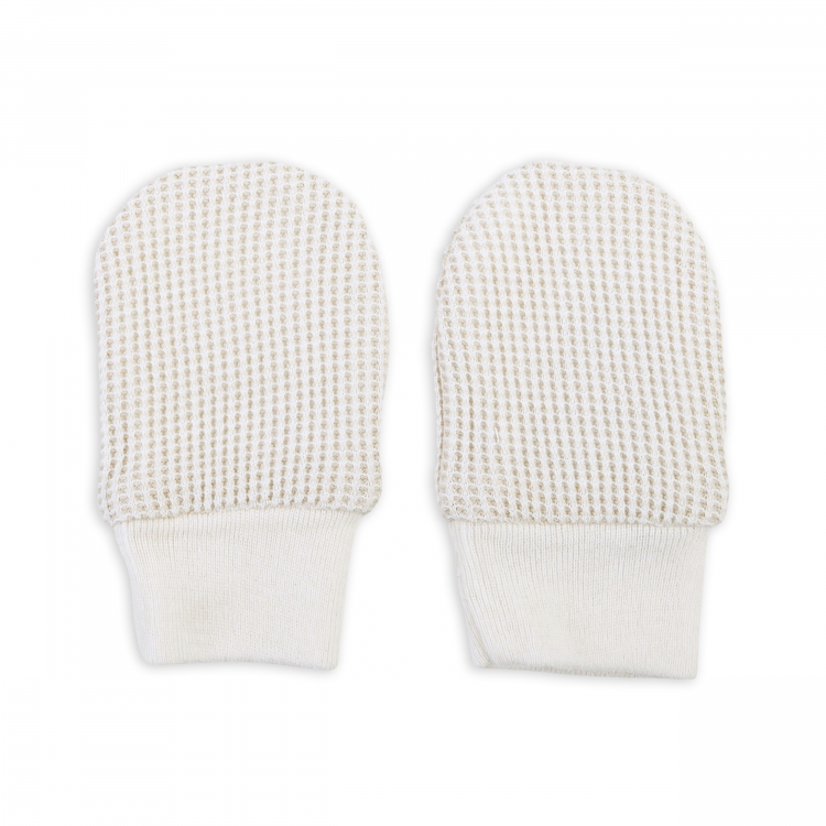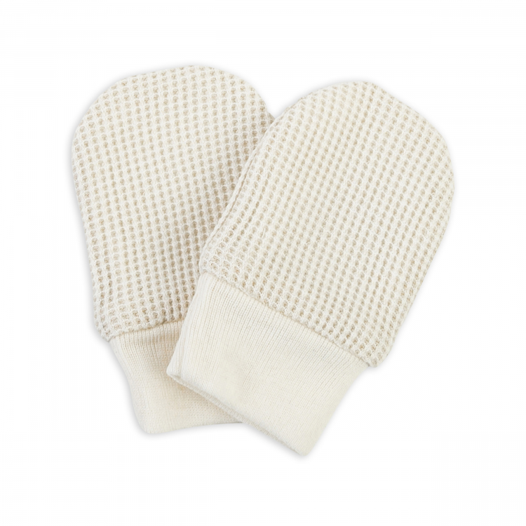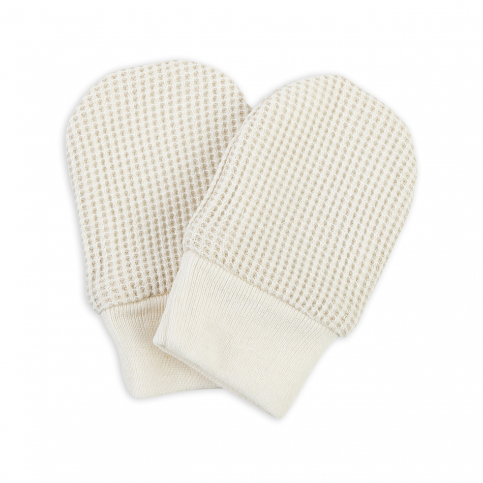 Baby scrats mittens made of cotton with a waffle structure. The baby mittens are specially designed to prevent newborns from scratching themselves with their sharp nails while sleeping. The anti-scratch mittens are lined. Easy to put on due to the stretchy rib material of the trim.