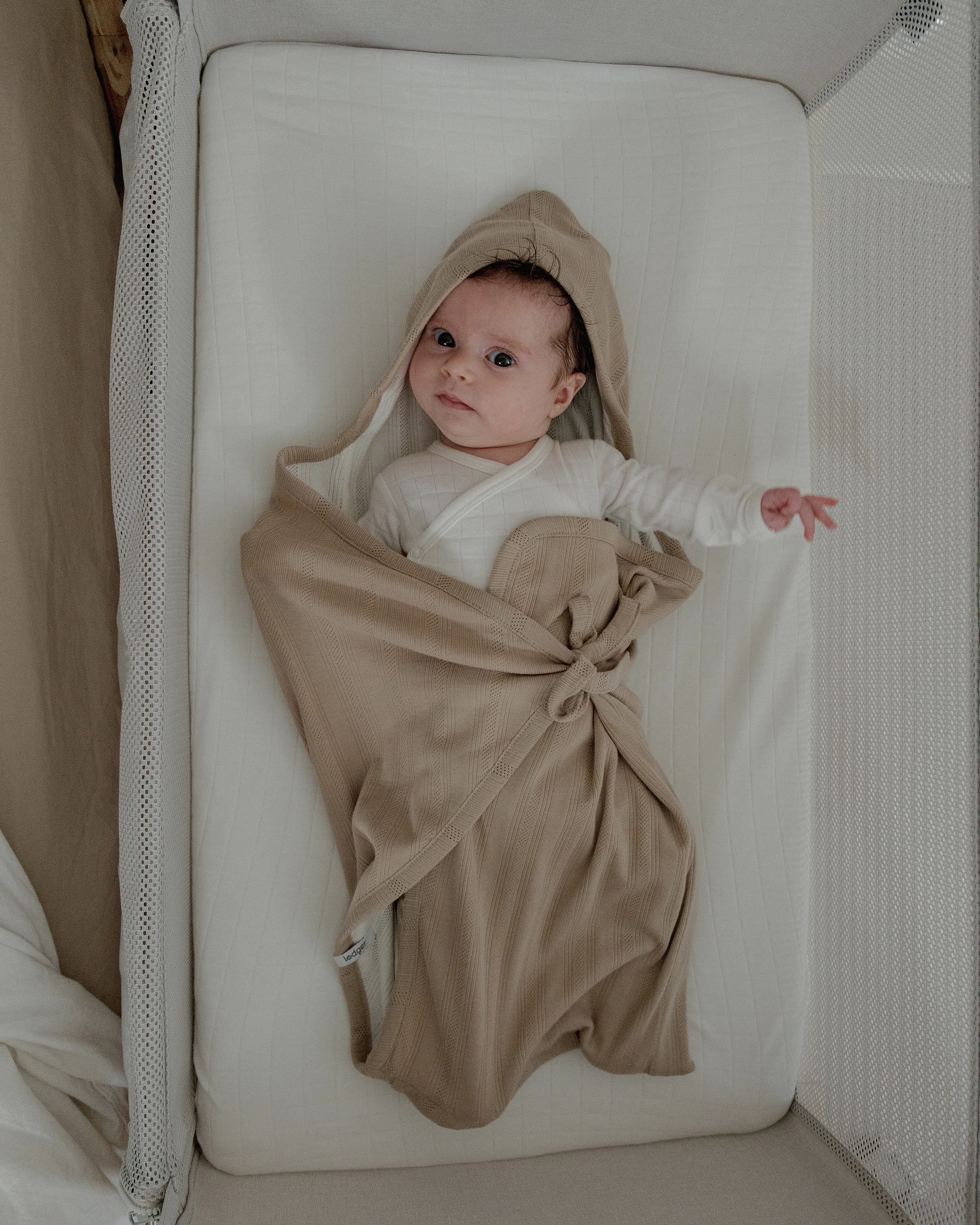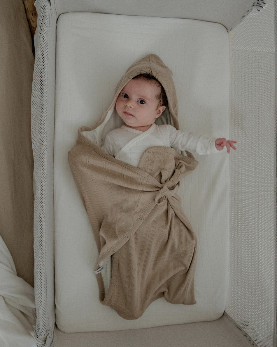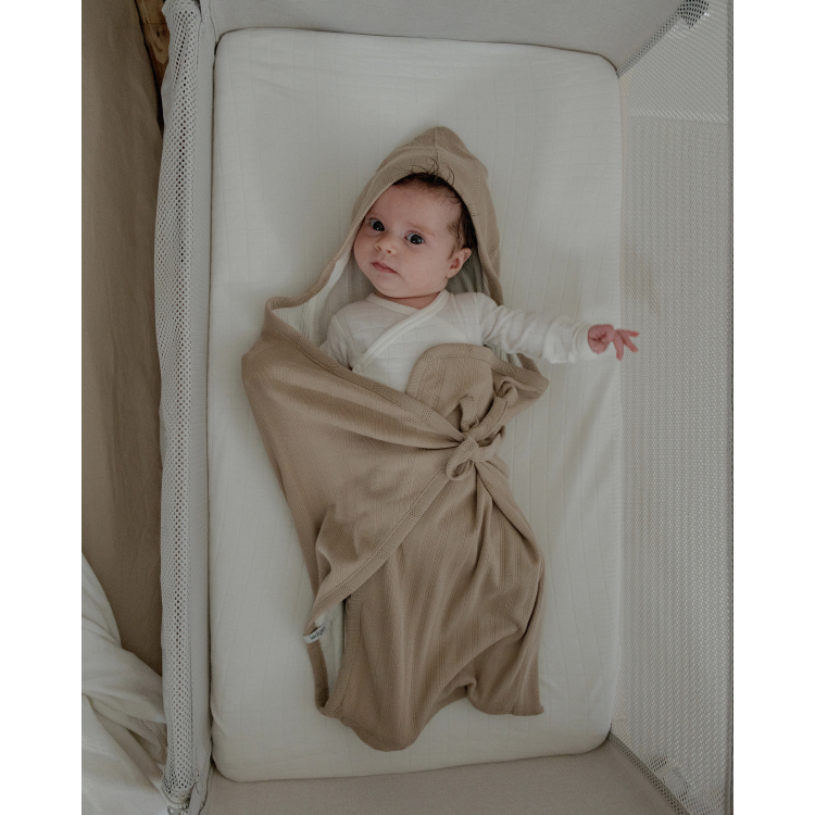 The infant wrap blanket is versatile, perfect for use during feeding, as a bath cape, or in a bassinet.