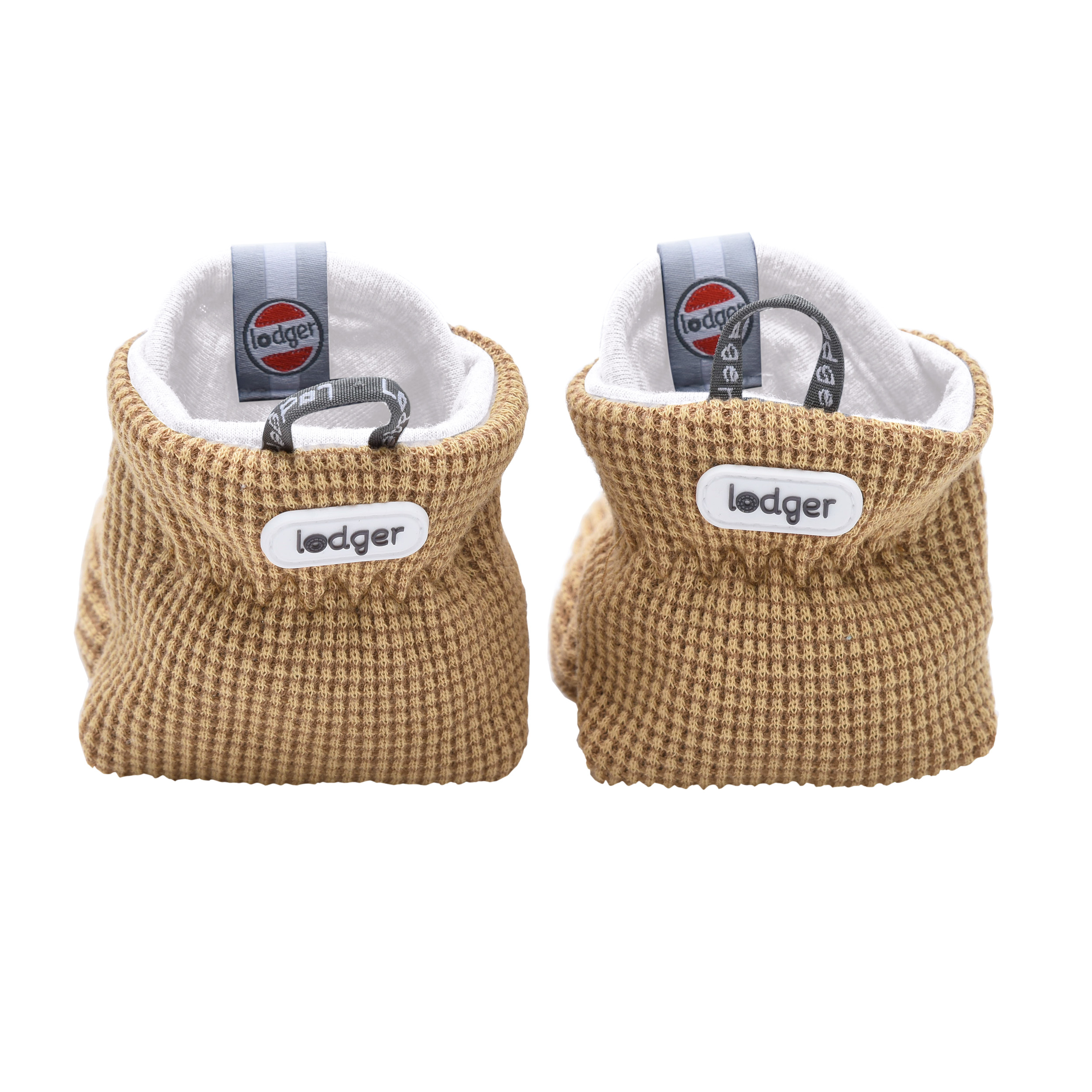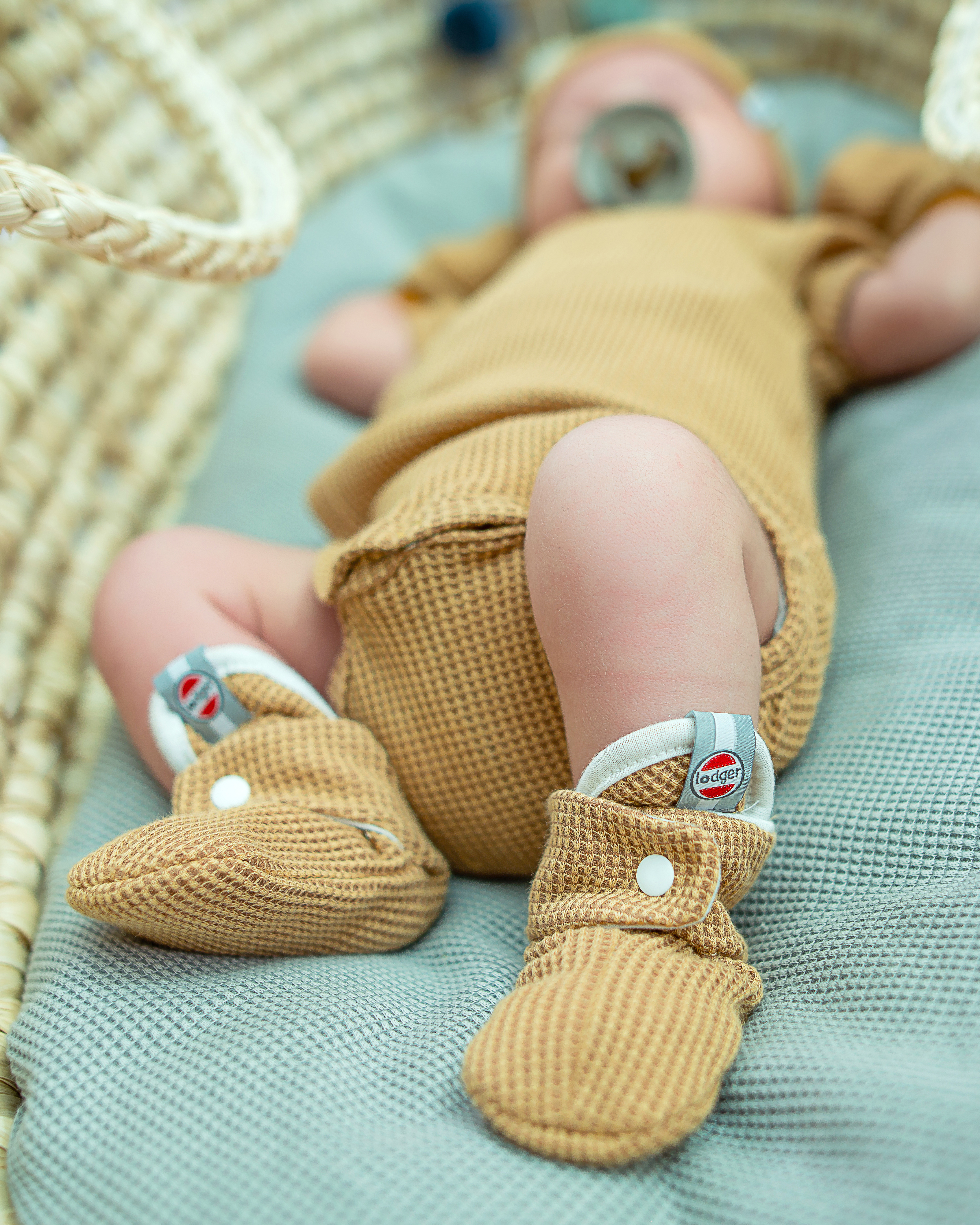 Chaussons doux en coton aéré 100% certifié Oeko-Tex : « confiance au textile ». Dotés d'une fermeture à bouton pression, ces chaussons s'enfilent facilement tout en les maintenant en place. Afin de lui permettre de ramper et de se tenir debout, la plus grande pointure de chaussons pour bébé (6-12 mois) a des semelles antidérapantes.