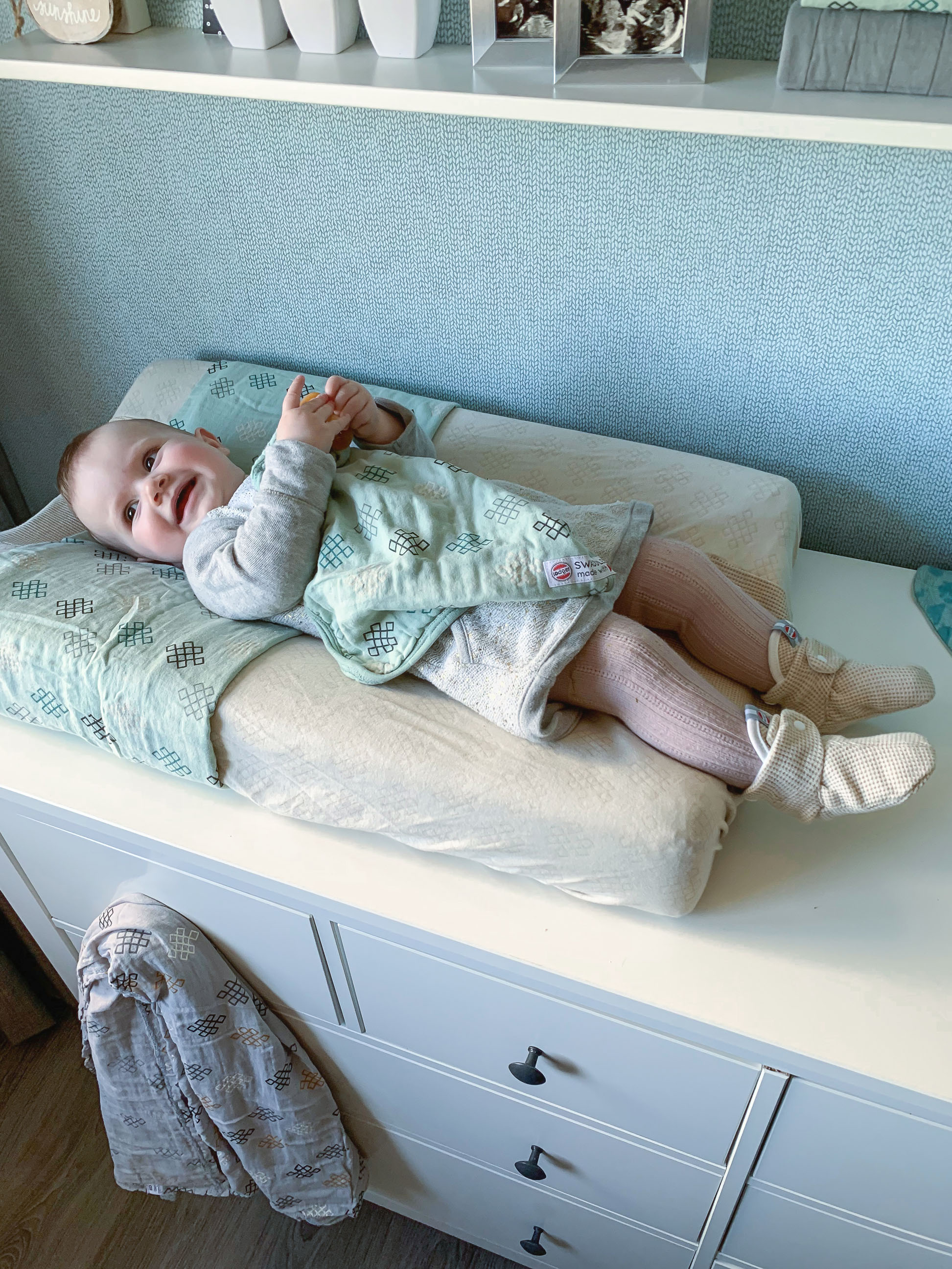 - Op het aankleedkussen als bescherming tegen spugen of andere ongelukjes