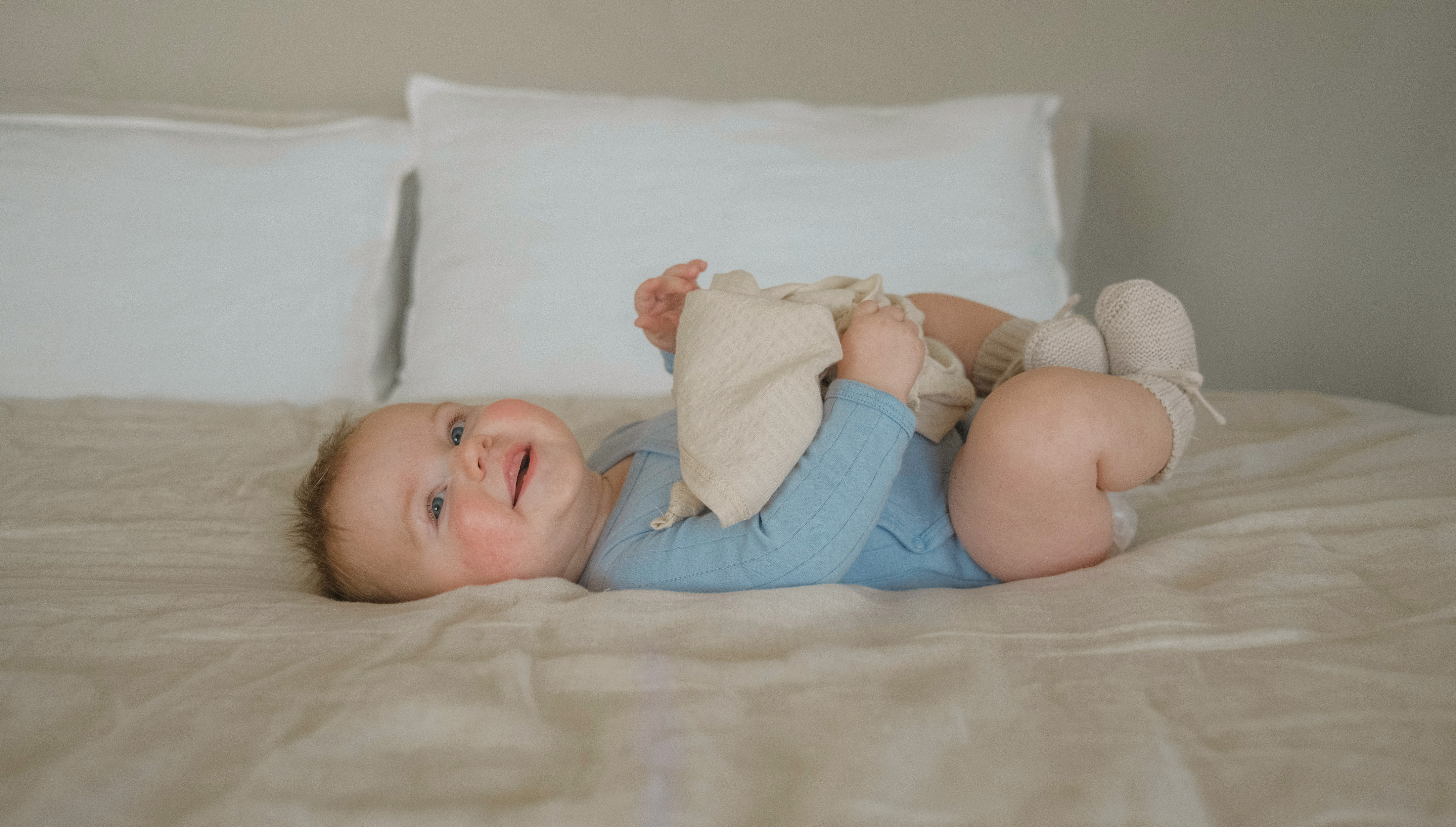 Baby in Lodger lange mouwen romper met overslag, slofjes aan en knuffeldoekje op bed
