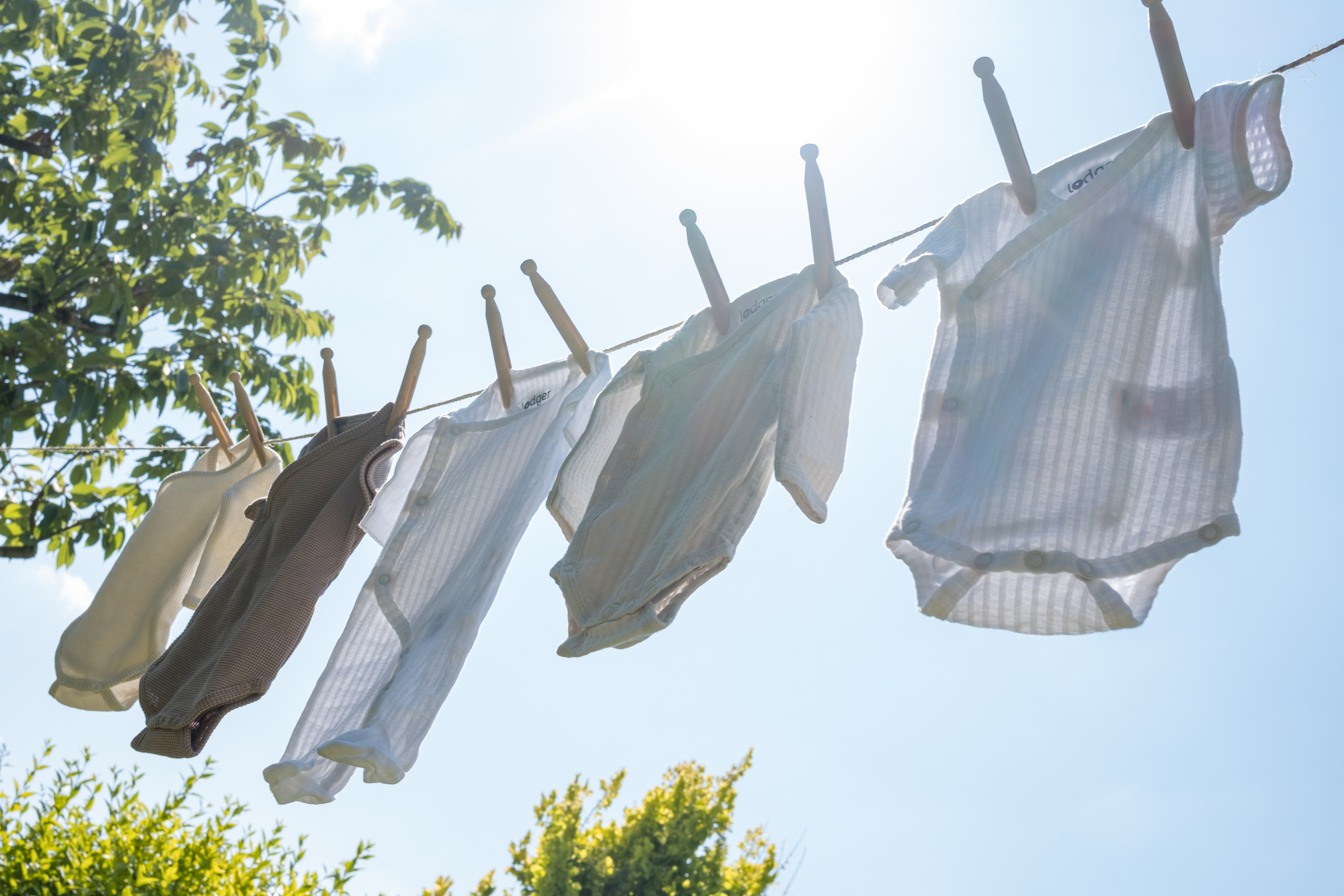 Verschillende Lodger items aan waslijn, zoals lange mouwen romper, korte mouwen overslagromper en boxpakje met overslag