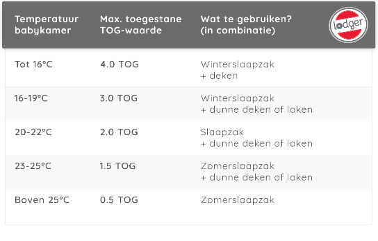 Zorg ervoor dat de temperatuur van de babykamer tussen de 16°C en 20°C ligt, met 18°C als ideale temperatuur. In deze tabel zie je bij welke temperatuur je welke TOG-waarde je maximaal mag gebruiken!