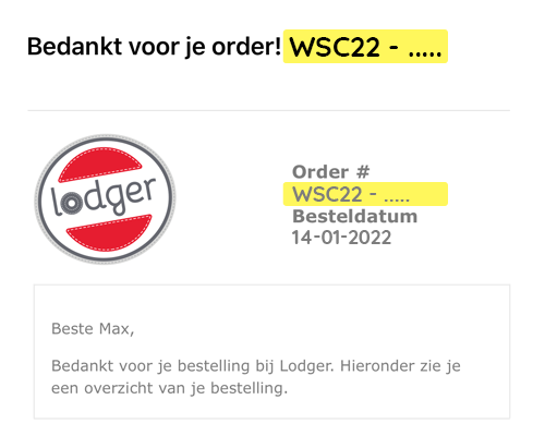 Wij gebruiken het ordernummer om jouw bestelling te kunnen achterhalen. Het ordernummer vind je in de bevestigingsmail van jouw bestelling, zie hieronder een voorbeeld: