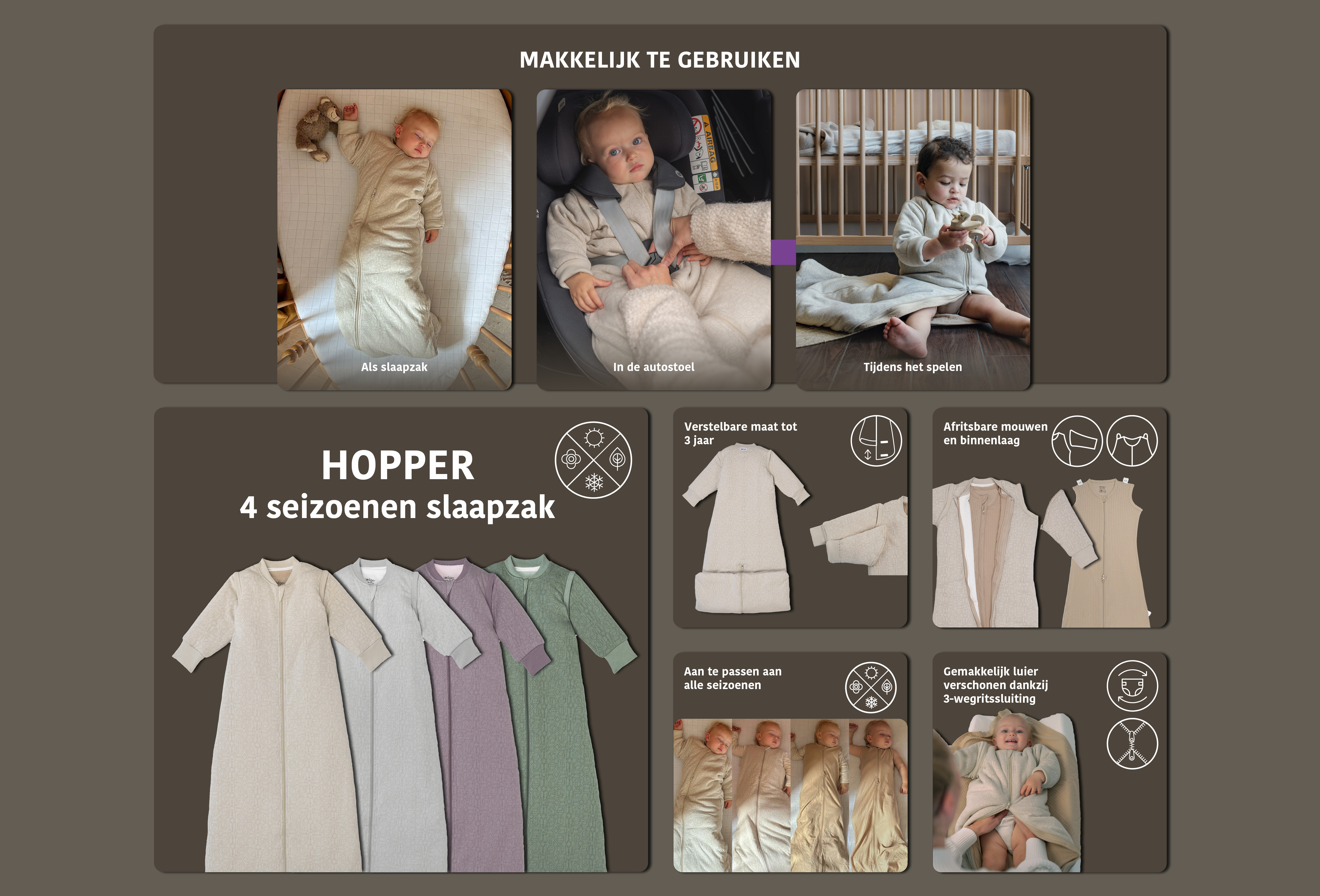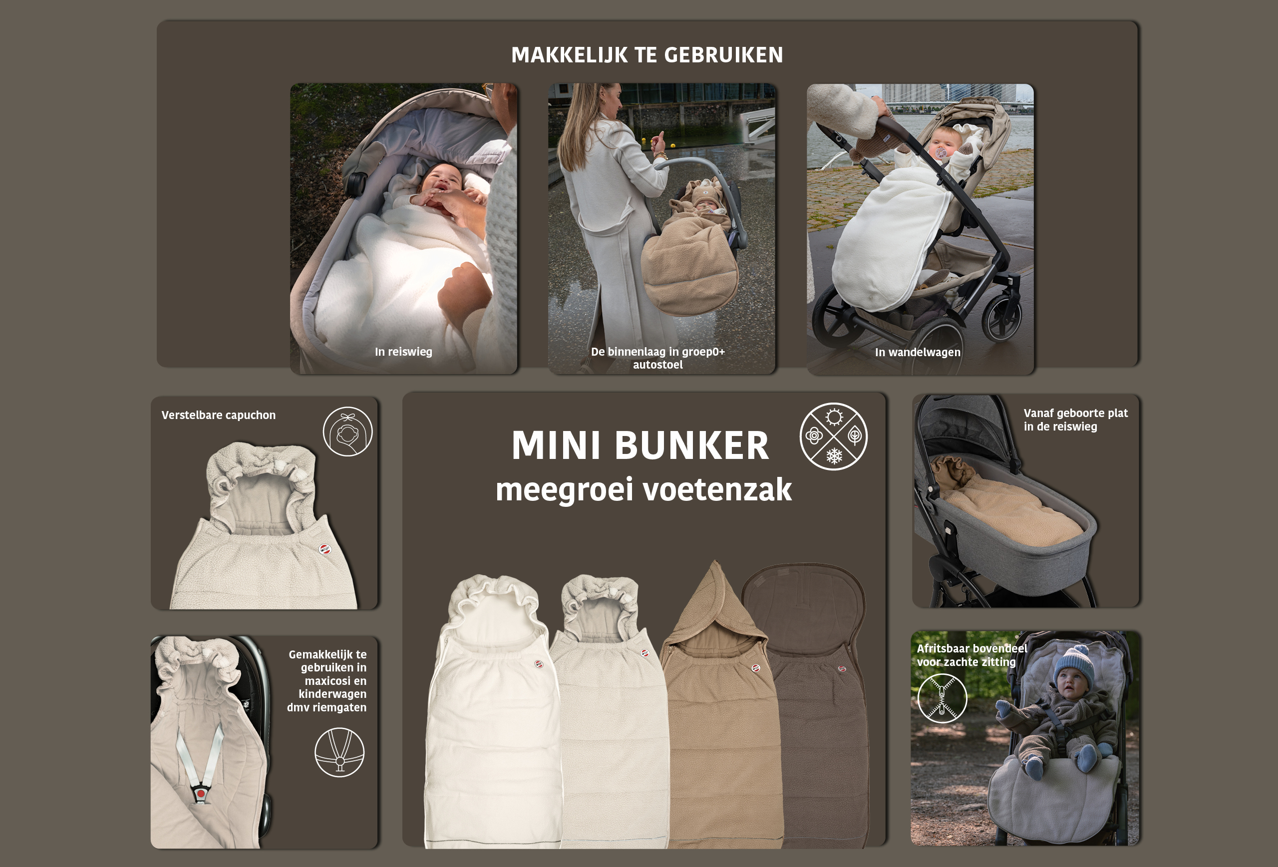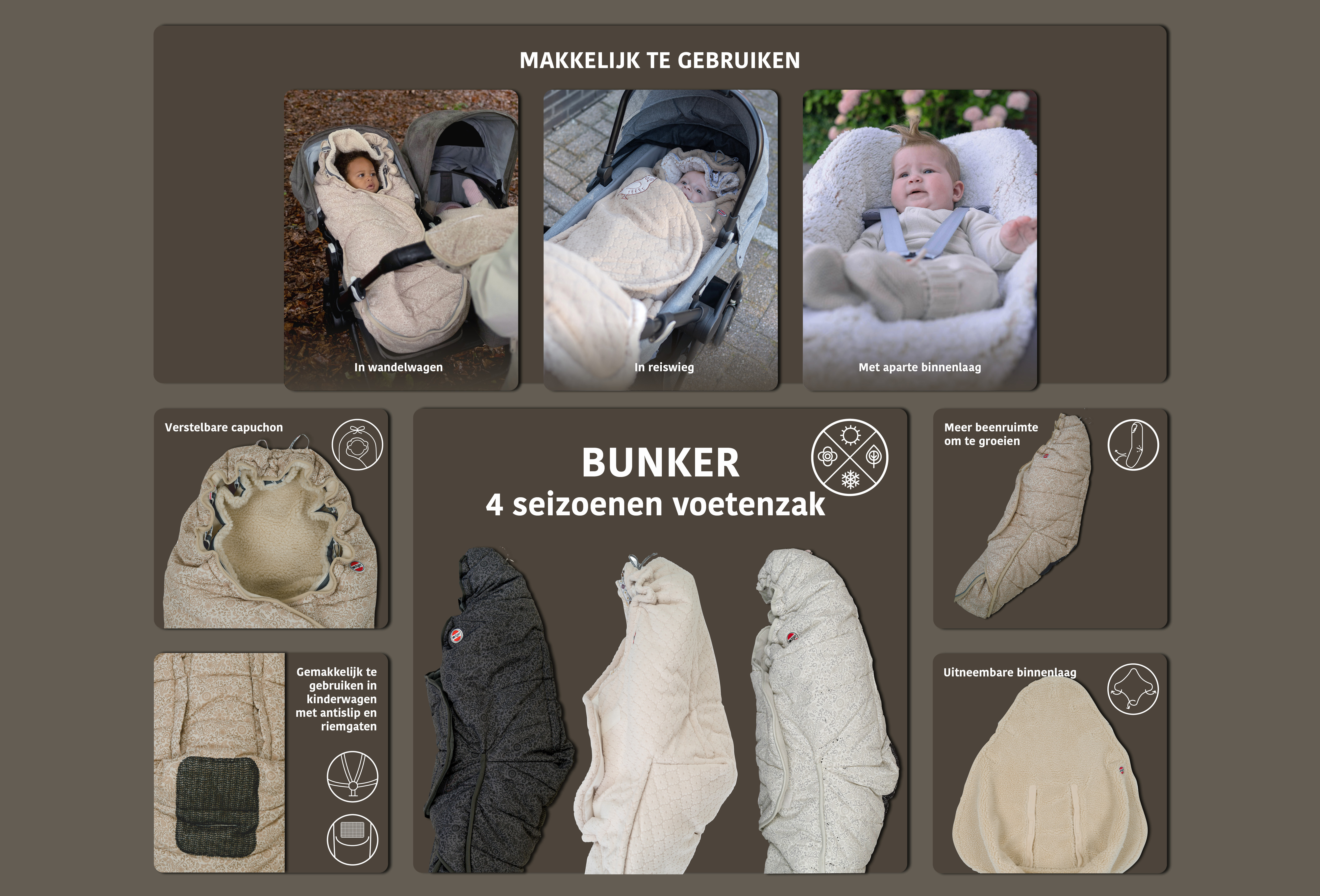 Het leven van ouders met een baby is al druk genoeg, daarom willen we het je gemakkelijker maken. Met onze multifunctionele producten, ook wel Multifunctionals genoemd, kun je snel schakelen en meer genieten van de mooie momenten. De collectie bestaat uit de Bunker voetenzak, de 4 seizoenen Hopper slaapzak, de Wrapper wikkeldeken en de Mini Bunker meegroei voetenzak. Deze producten zijn op verschillende manieren te gebruiken, zodat ze altijd passen bij wat jij nodig hebt. Ze zijn gemaakt van sterke materialen die lang meegaan, wat ze zowel handig als duurzaam maakt. Zo houd je meer tijd over voor de leuke dingen en kun je volop van je kindje genieten!